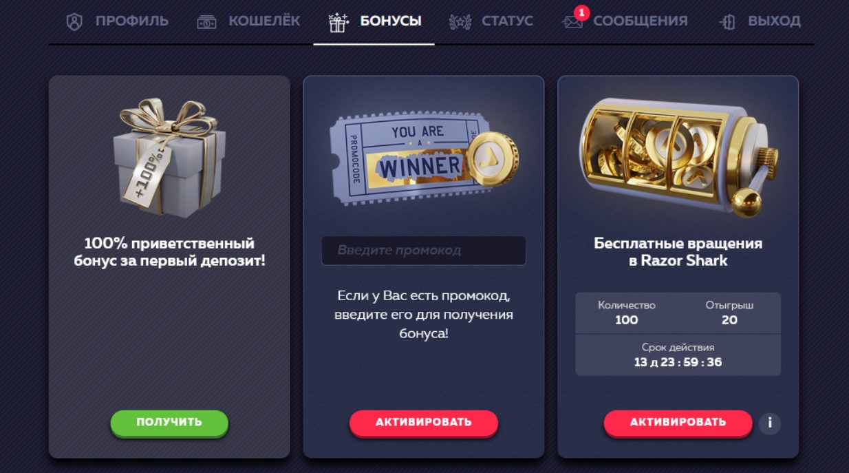 Выплата осуществляется автоматически 1-го числа каждого месяца. В любой момент Вы можете Активировать кэшбэк или отказаться от него, самостоятельно через интерфейс в профиле игрока. При активации кэшбэк, сумма зачисляется на бонусный баланс и все последующие ставки учитываются в отыгрыше. Вывести кэшбэк можно, выполнив отыгрыш с вейджером — x5.