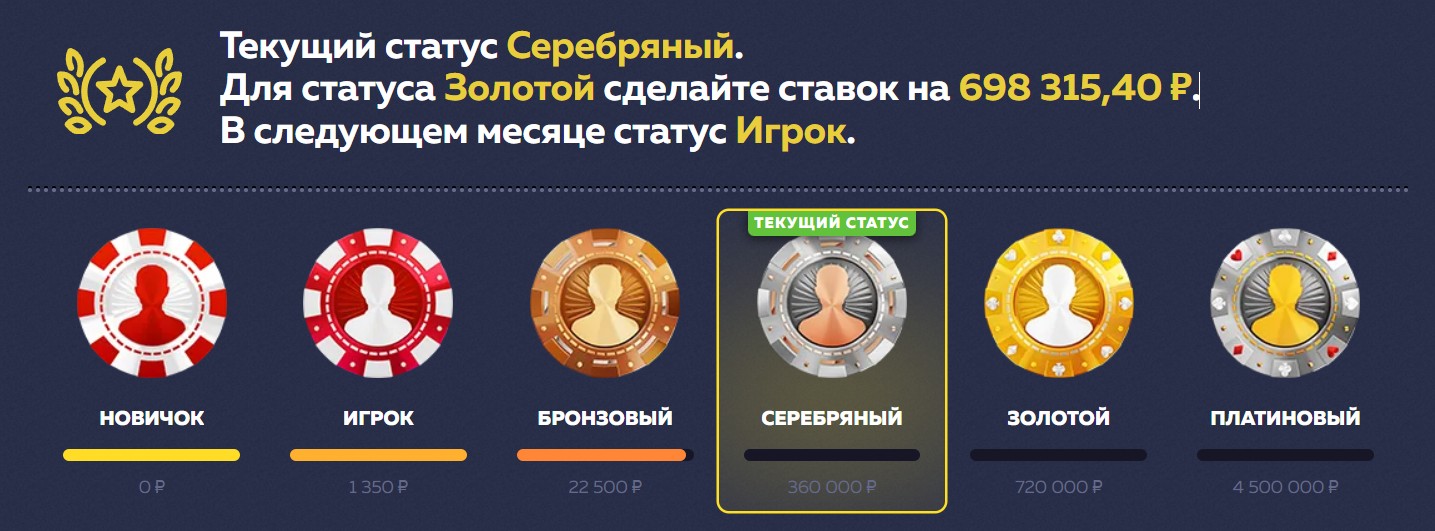 Играя в казино Вавада каждому игроку присваивается статус. Он автоматически повышается при достижении игроком определенной суммы ставок в слотах: